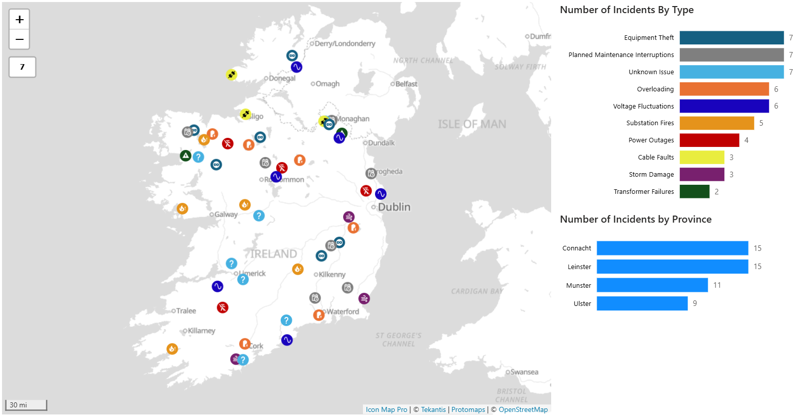 A practical pattern is to map incidents as points, service zones as polygons, and size or colour symbols by customer impact, severity or restoration stage.